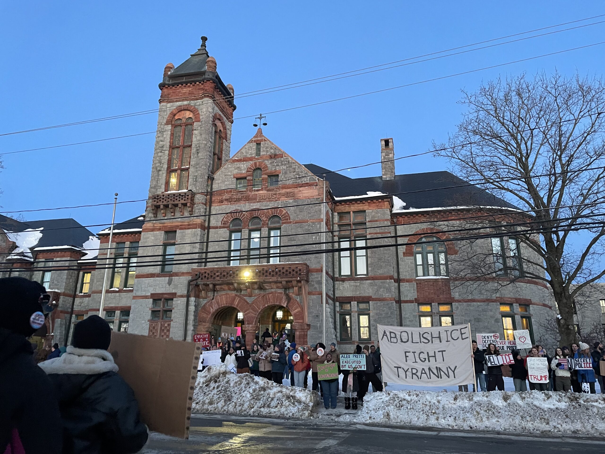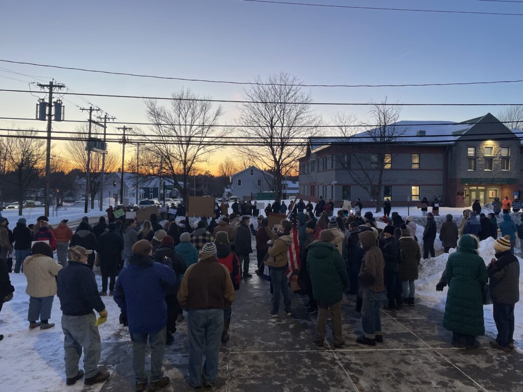 Before the meeting, more than 200 people from across the county protested the 287(g) agreement outside the SLC Courthouse. Ginger Storey-Welch is the leader of North Country Neighbors for Civic Engagement, a grassroots volunteer organization that helped organize the protest. She also serves as the vice chair of the St. Lawrence County Democratic Committee. “This is a democratic process. Citizens are gathering with the right to assemble, the right to free speech, and we are appealing to our elected officials to vote no on this. We hope that they will see us,” she said.