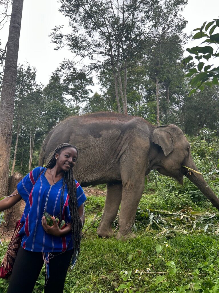 Wande Balele ’27 poses as in front of an elephant in Thailand. PHOTO COURTESY OF CAITLIN HATZ