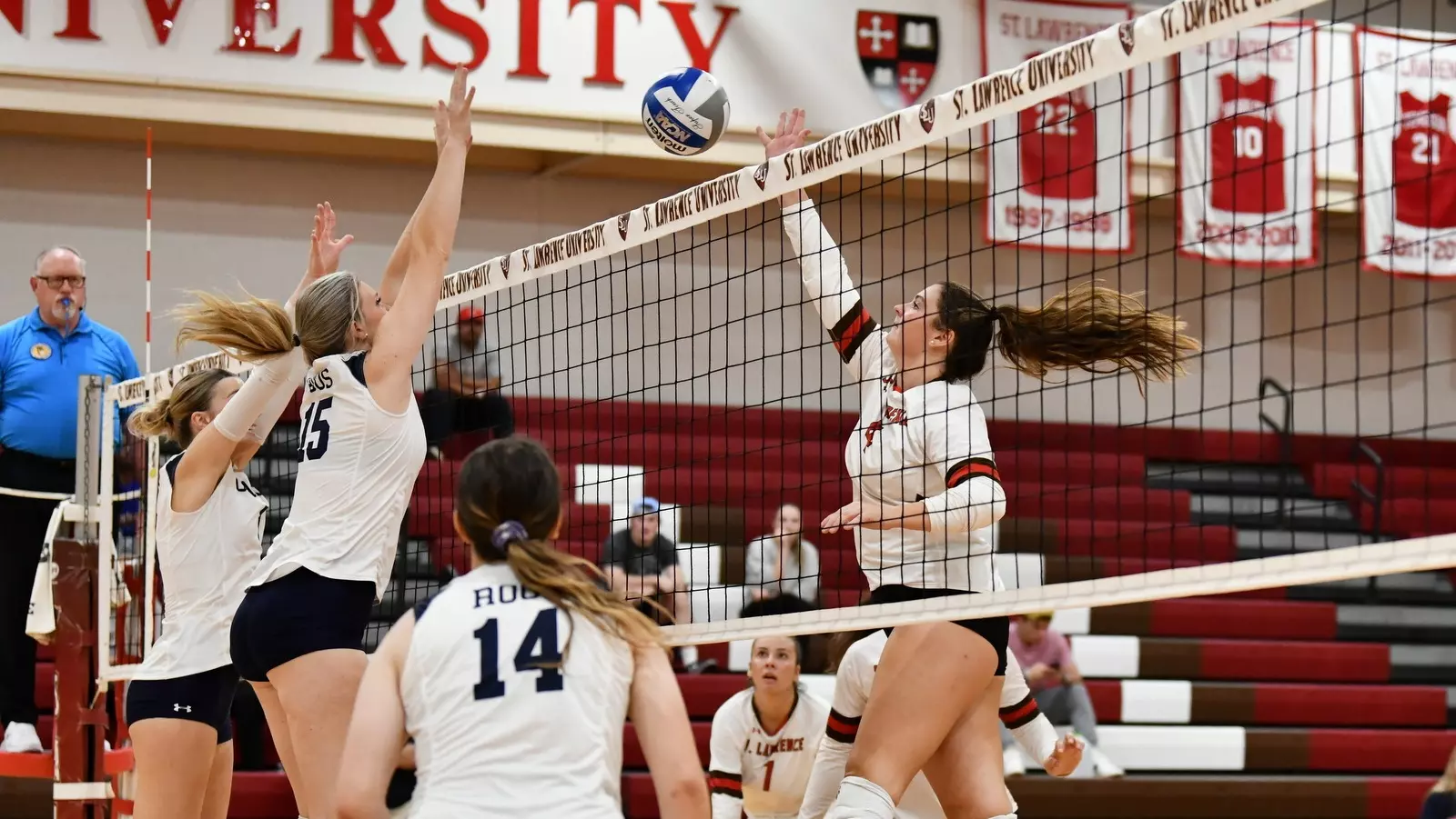 Vanessa Latam ’27 posted 30 assists and added eight kills to lead the St. Lawrence University volleyball team to a come-from-behind 24-26, 25-18, 25-20, 25-14 win over SUNY Canton at the Ronald T. Burkman Gymnasium last Tuesday night.