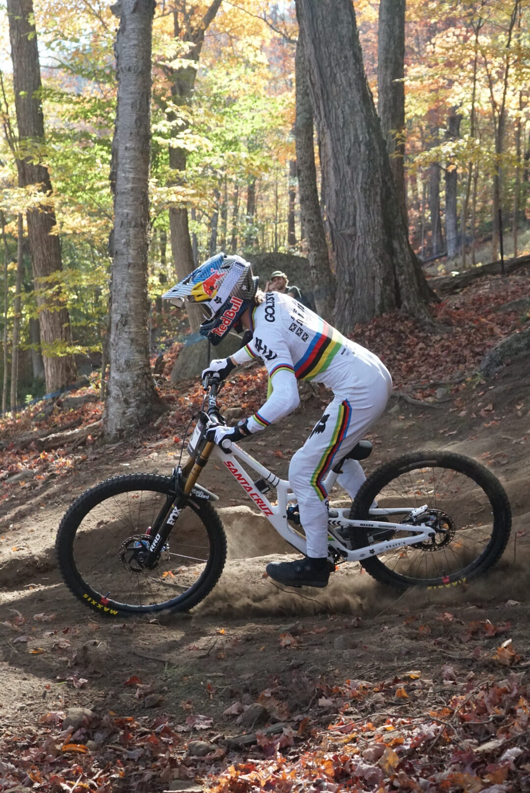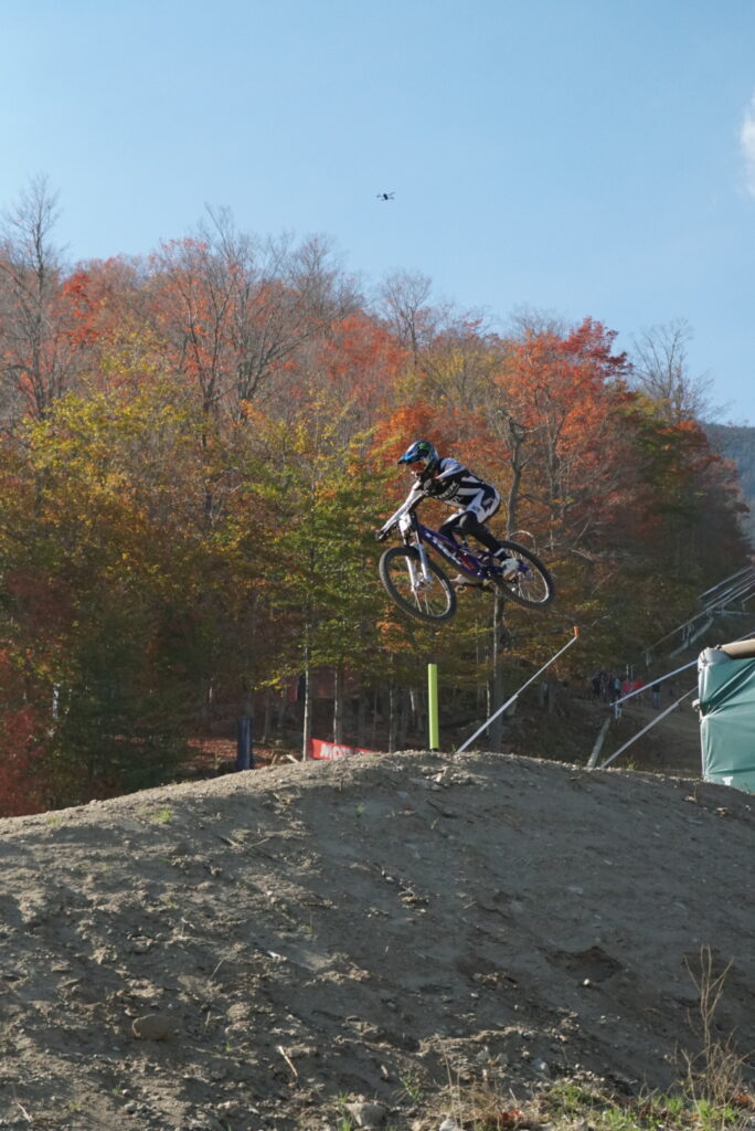 The professional Downhill races took place on Saturday. The sun was shining, the leaves were changing, but the ground was so dry I couldn’t even count the number of times I blew my nose and pulled the tissue away to find dirt stains. Emmons Whited ’27 noted that the conditions were tough. It was “super loose and dusty, so the track was changing a bunch – each lap it kinda got worse and worse for the riders as holes and trenches were dug out,” he said. Whited also noted that he thought Whiteface did a great job with the venue.
